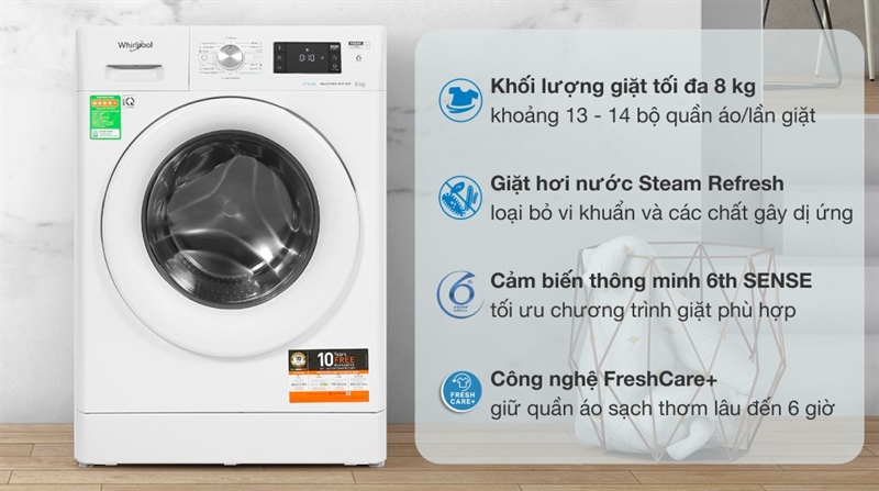 Máy giặt Whirlpool FreshCare Inverter 8 kg FWEB8002FG 2022