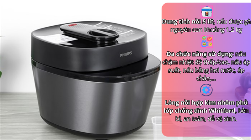 > Từ khóa SEO: Nồi áp suất điện Philips HD2151/66, dung tích 5 lít, chống dính Whitford, nấu áp suất, 35 chương trình nấu, an toàn tự động.