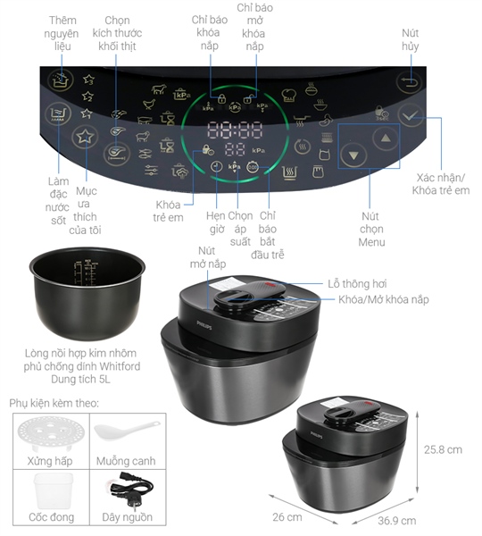 | Chế độ an toàn | - Nắp nồi không mở ra được khi có áp suất cao - Khóa an toàn giữa nắp và thân nồi - Van xả áp tự động - Khóa bảng điều khiển |