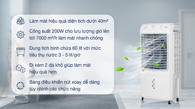 - Trang bị bánh xe dễ dàng di chuyển, có đi kèm 2 đá khô nâng cao hiệu suất làm mát.