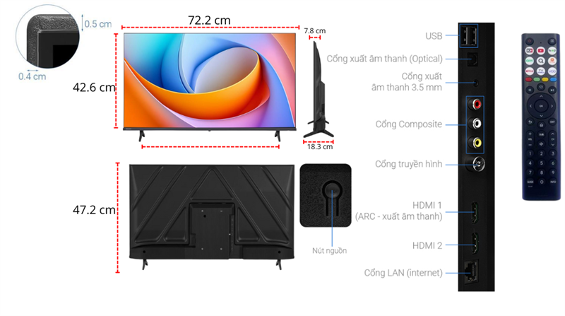 • Kích thước không chân, treo tường: Ngang 72.2 cm - Cao 42.6 cm - Dày 7.8 cm