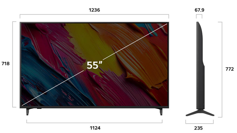 • Kích thước không chân, treo tường: Ngang 123.6 cm - Cao 71.8 cm - Dày 6.79 cm