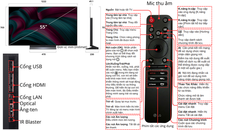 • Kích thước không chân, treo tường: Ngang 122.2 cm - Cao 70.3 cm - Dày 4.51 cm