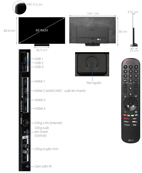 • Kích thước không chân, treo tường: Ngang 144.1 cm - Cao 82.6 cm - Dày 4.51 cm