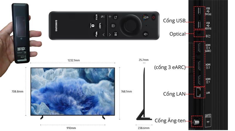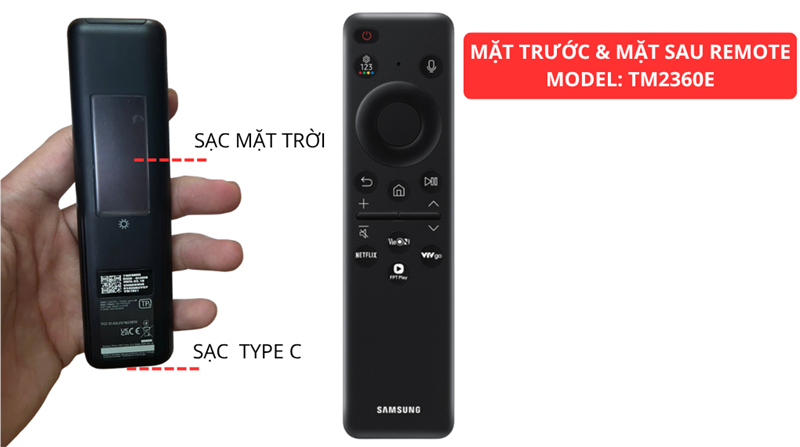 Điểm đặc biệt đáng chú ý là chiếc remote SolarCell đi kèm có thể sạc qua ánh sáng mặt trời tự nhiên hoặc ánh đèn trong nhà. Không chỉ tiện lợi, thiết kế này còn giúp giảm thiểu việc sử dụng pin dùng một lần, góp phần bảo vệ môi trường. Đây là một bước tiến đầy ý nghĩa trong hành trình phát triển công nghệ bền vững của Samsung.