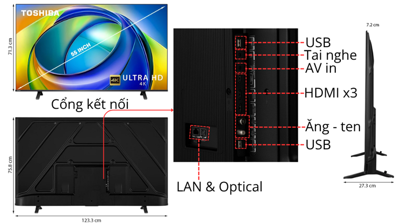 • Kích thước không chân, treo tường: Ngang 123.3 cm - Cao 71.5 cm - Dày 7.2 cm