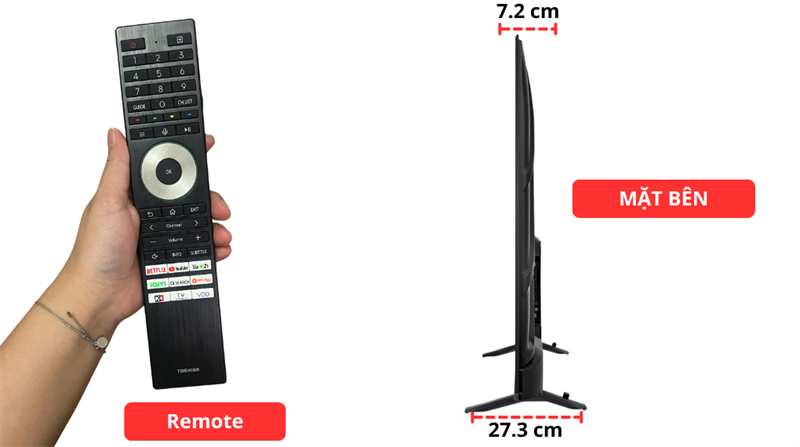 Smart Tivi QLED Toshiba AI 4K 55 inch 55M450RP sở hữu thiết kế tinh giản với viền siêu mỏng, mang đến vẻ đẹp hiện đại và thanh lịch. Kích thước màn hình 55 inch của tivi không chỉ tạo điểm nhấn cho phòng khách mà còn mang lại cho người dùng trải nghiệm xem phim thoải mái trên phạm vi rộng. Chân đế chữ V ngược được làm từ vật liệu cao cấp, đảm bảo độ vững chắc trên nhiều bề mặt, dễ dàng hòa hợp với mọi phong cách nội thất.