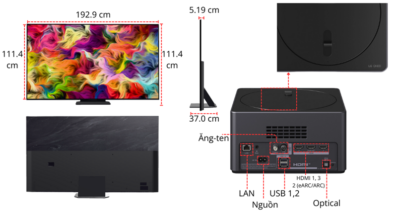 - Kích thước không chân, treo tường: Ngang 192.9 cm - Cao 111.4 cm - Dày 5.19 cm