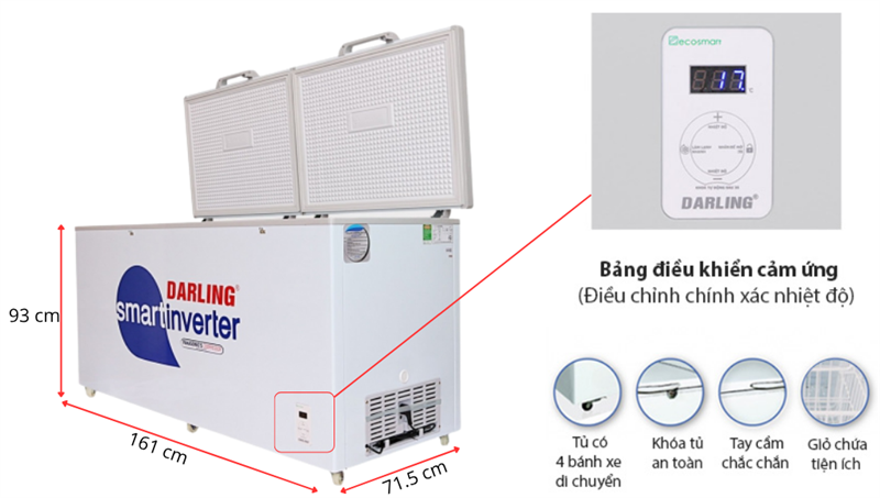 Sản phẩm có dung tích lớn 770 lít, đảm bảo bạn có đủ không gian lưu trữ mà còn giữ cho thực phẩm luôn tươi ngon và mát lạnh. Tủ đông Darling Inverter phù hợp cho những nơi cần lưu trữ lớn như siêu thị, cửa hàng tạp hóa, và các cơ sở kinh doanh thực phẩm khác.
