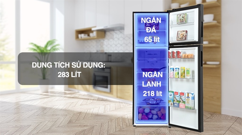 - Dung tích sử dụng 283 lít, đáp ứng tốt nhu cầu lưu trữ thực phẩm của gia đình từ 2 - 3 người hoặc gia đình ít thành viên hơn nhưng có nhu cầu lưu trữ cao.