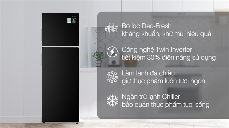 Công nghệ tiết kiệm điện- Hỗ trợ công nghệ Twin Inverter sử dụng máy nén Inverter cùng quạt Inverter cho thiết bị vận hành mượt mà, êm ái, giảm hao phí điện năng của gia đình đồng thời giúp làm lạnh nhanh, giữ thực phẩm luôn tươi ngon, giữ trọn hương vị trong thời gian bảo quản.