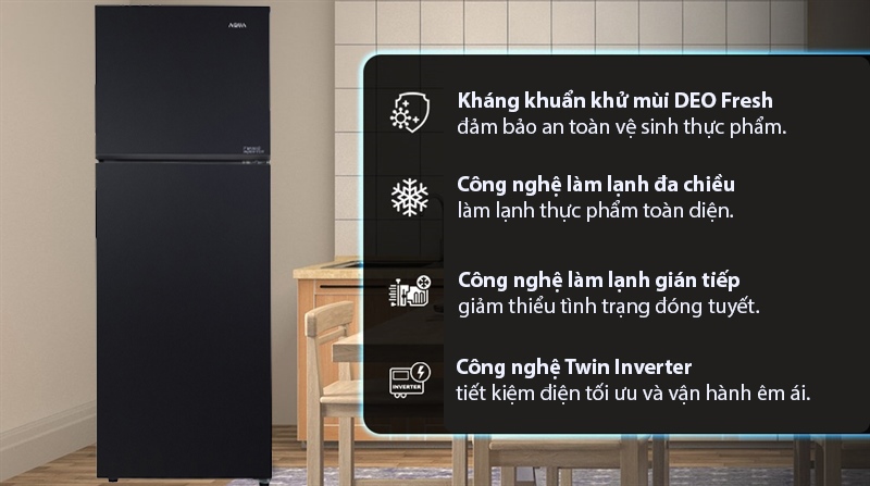 - Công nghệ làm lạnh gián tiếp: Giảm thiểu tình trạng đóng tuyết trong ngăn đá và ngăn lạnh, giúp việc bảo quản thực phẩm tốt hơn và thuận tiện cho việc xả tủ sau khoảng thời gian dài sử dụng tủ lạnh Aqua Inverter.