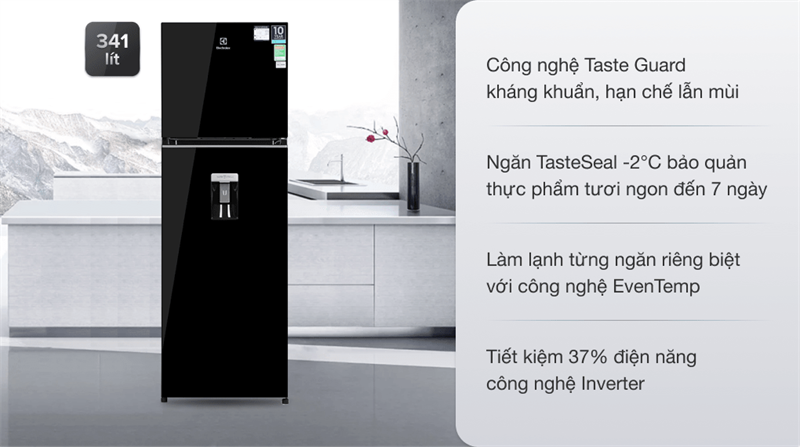 Dung tích sử dụng 341 lít phù hợp với 3 - 4 ngườiTủ lạnh Electrolux Inverter 341 lít ETB3740K-H 2021 - THÁI LAN có dung tích sử dụng là 341 lít với ngăn đá 74 lít và ngăn lạnh 267 lít để được nhiều loại thực phẩm, phù hợp yêu cầu cho gia đình từ 3 – 4 người.