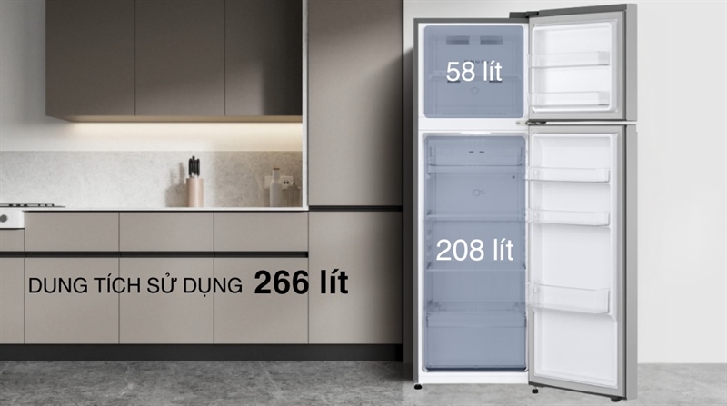- Dung tích sử dụng 266 lít, trong đó ngăn lạnh 208 lít và ngăn đá 58 lít - phù hợp cho nhu cầu sử dụng hằng ngày của hộ gia đình nhỏ.