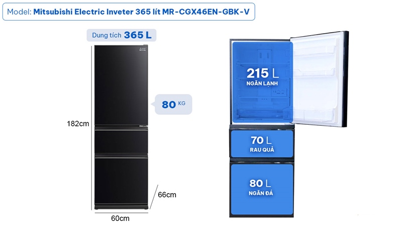 Thông số kỹ thuật Tủ lạnh Mitsubishi Inverter 365 Lít MR-CGX46EN-GBK-V