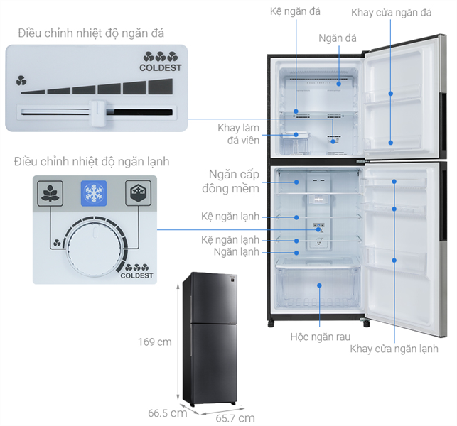 - Phần ngăn đá có một kệ khay đá để ngăn ra làm đôi, tiện lợi hơn trong quá trình bảo quản và sắp xếp thực phẩm. Có hộp đá xoay có thể dễ dàng làm các viên đá nhỏ và bỏ ra ngoài khi cần tăng không gian lưu trữ. Phần cánh tủ có thêm khay đựng để đồ tiện lợi.