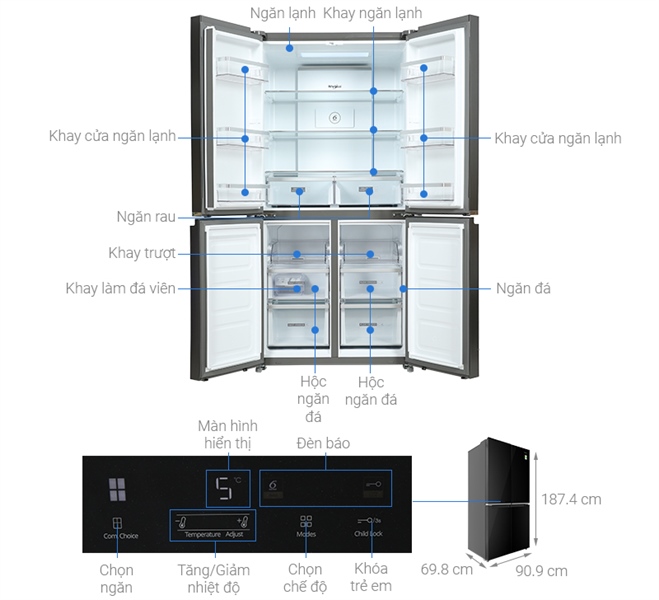 · Kích thước tủ lạnh: | Cao 187.4 cm - Rộng 90.9 cm - Sâu 69.8 cm - Nặng 124 kg |